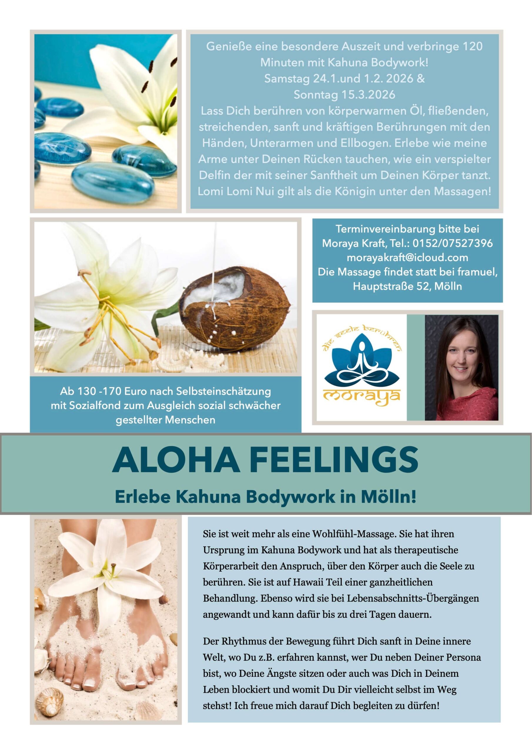 Ich freue mich, Euch am 24.1., 1.2. und 15.3.2026 in Mölln zu einer hawaiianischen Begegnung in Form einer Massage begrüßen zu dürfen.
